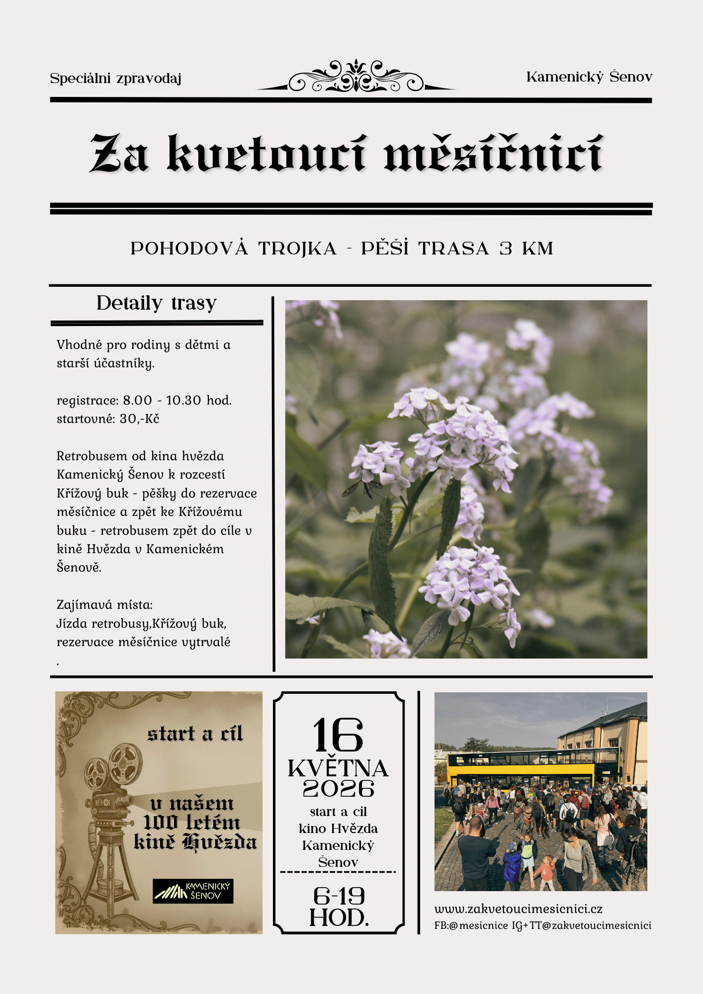Přistavenými autobusy od kina Hvězda v Kamenickém Šenově pojedete k rozcestí Křížový buk. Odtud pěšky do rezervace měsíčnice vytrvalé a zpět ke Křížovému buku. Z Křížového buku autobusem zpět do cíle v kině Hvězda v Kamenickém Šenově.