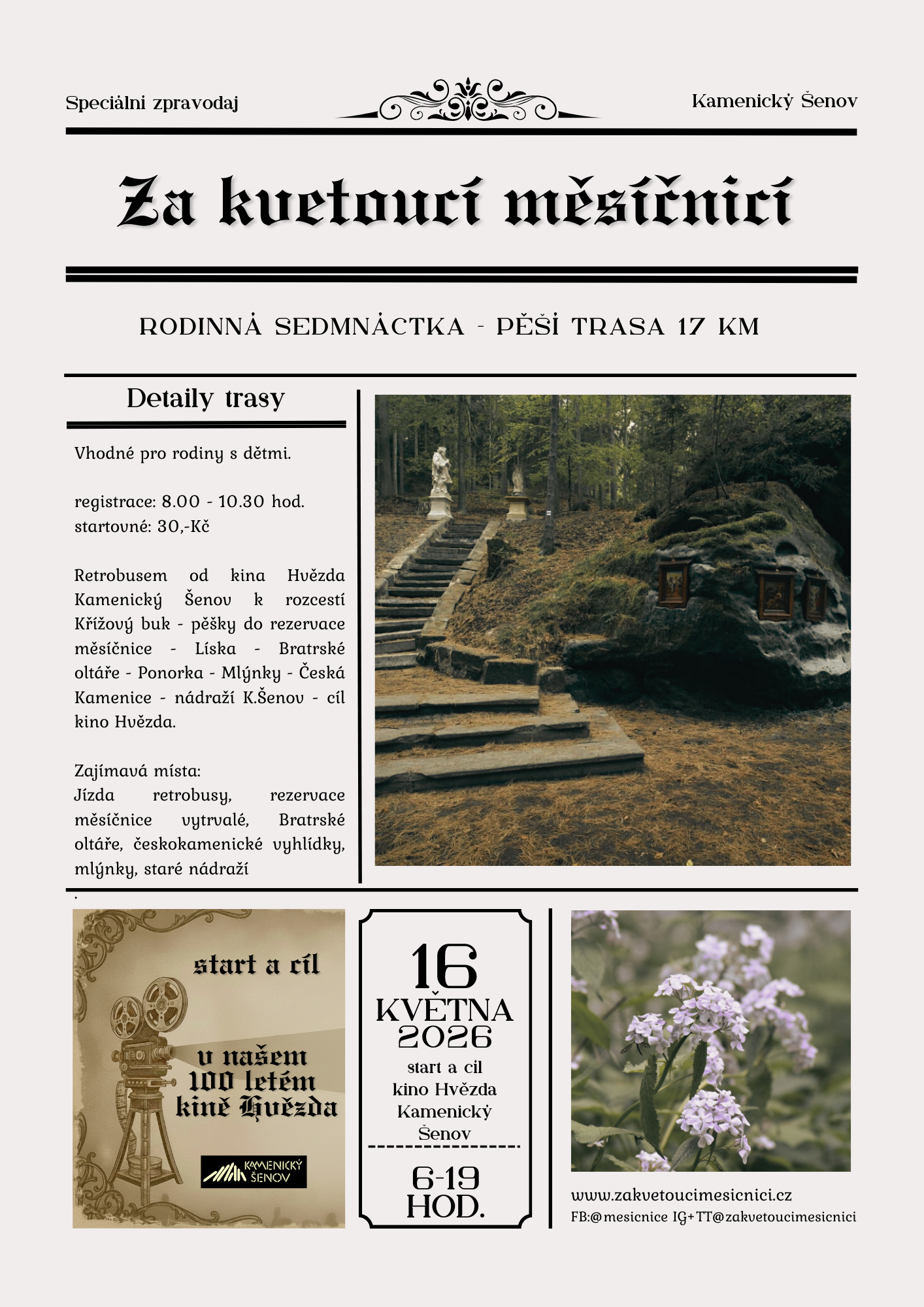Autobusem od kina Hvězda Kamenický Šenov k rozcestí Křížový buk – odtud pěšky po zelené poznávací stezce do rezervace měsíčnice vytrvalé a k rozcestí Trajek – po modré značce rozcestí v Sedle pod Studencem, Líska, Bratrské oltáře – po žluté značce vyhlídka Ponorka, Žába, náměstí Česká Kamenice – po zelené značce k viaduktu v České Kamenici – po cyklostezce č.8 Severní k přejezdu v Kamenickém Šenově – po zelené značce nádraží, po Kostelním vrchu do cíle v kině Hvězda Kamenický Šenov.